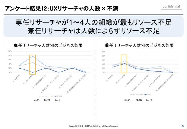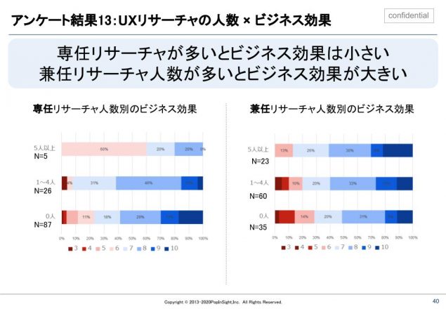 一方、兼任リサーチャの人数が多い企業の回答者は、UXリサーチのビジネス効果を高く評価する傾向がありました。