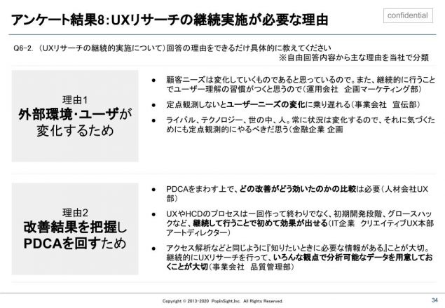 1つ目は、外部環境・ユーザは常に変化するため。「継続的に実施することでユーザ理解の習慣がつく」「定点観測しないとユーザニーズの変化に乗り遅れる」といった回答がありました。
