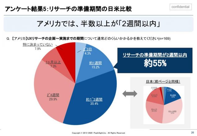 一方、アメリカの調査では、55%が「2週間以内」と回答しており、日本のUXリサーチの準備期間がアメリカと比べて長い傾向にあると示唆されました。