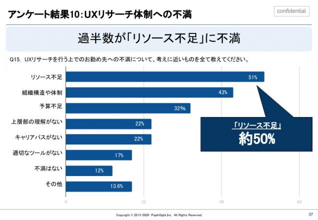 UXリサーチを実施するうえでの不満として最も多かったのは「リソース不足」(50%)でした。