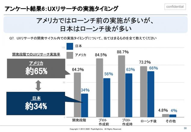一方、日本では、①開発段階でのUXリサーチの実施はわずか34%にとどまり、UXリサーチの実施は④ローンチ後が最も多い(66%)という結果でした。