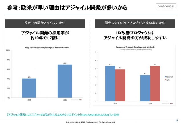 ニールセンの調査によると、アメリカでアジャイル型の開発手法が採用されるケースはこの10年で1.7倍に増えています。また、アジャイル型開発チームは、ウォーターフォール型開発チームに比べて開発の成功度をより高く評価するという結果も出ています。
