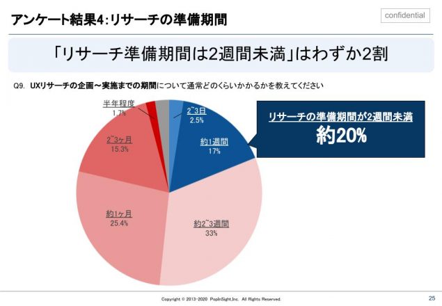 UXリサーチの準備(企画~実施)期間について、「2週間未満」という回答はわずか20%以下でした。