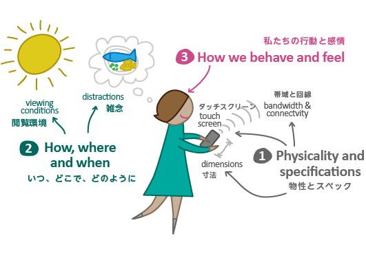 ユーザーはいつでもモバイルデバイスを利用できるため、頻繁に利用する傾向にあります。バスに乗っている時でも、道を歩いている時でも、またテレビを見ている時でもデバイスを利用することができます。私たちはデバイスを「ながら利用」することがよくありますよね? つまり、私たちは異なる閲覧環境、または様々な雑念を伴ってモバイルデバイスを利用しているのです。