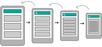 マトリョーシカ型はコンテンツの詳細を縦に並べて表示していくパターンです。ユーザーが操作に困った状況では、この型によって迅速かつ容易にユーザーをナビゲーションすることができます。また、ページを前後に移動するという操作方法なので、ユーザーはコンテンツ内の自分の居場所を特定しやすくなります。