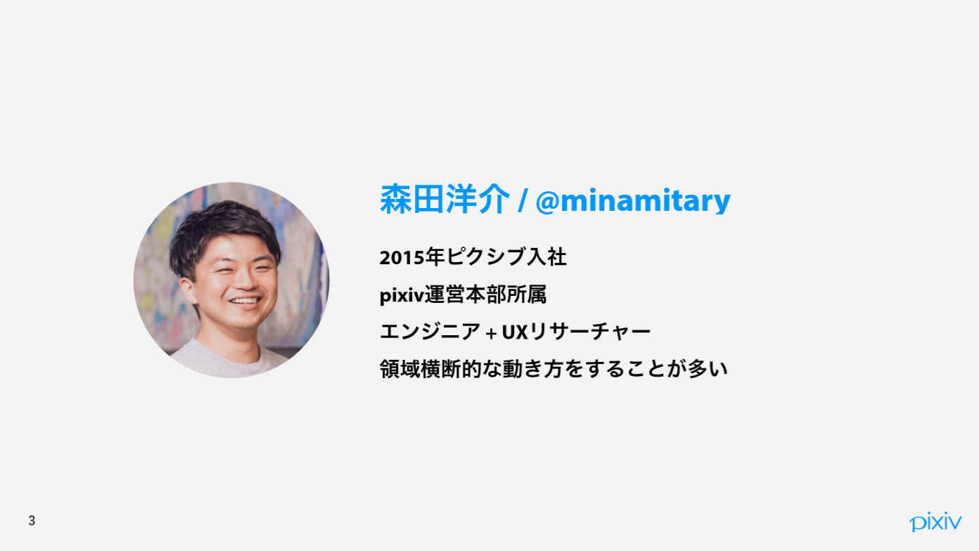 ピクシブ株式会社の森田と申します。もともとはエンジニアでしたが、現在はUXリサーチャーを兼任しております。弊社では、「創作活動がもっと楽しくなる場所を創る」という理念のもと、pixivというクリエイター向けのプラットフォームのほか、漫画アプリやECサービスなどを展開しています。
