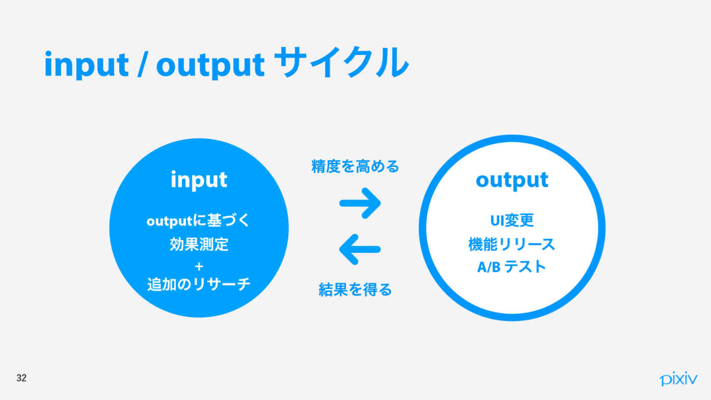 inputがあればoutputもあります。inputがユーザに対する解像度を高めて、その結果UI変更や機能リリースなどの施策の精度が高まります。それが左から右の流れです。