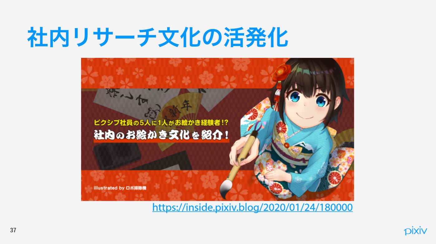 ピクシブでは、もともと趣味でモノを作っている人間がたくさんいます。お絵かきブートキャンプという社内イベントでは1ヵ月に1枚は絵を描いて持ち寄り、ご飯を食べながら感想を伝え合っています。
