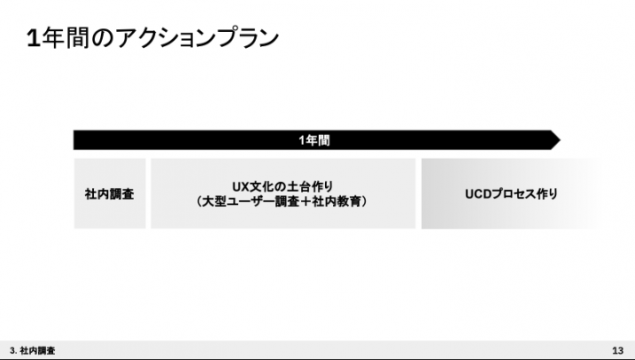 このプランは、社内調査・UX文化の土台づくりを最初の半年で実施し、残る半年でUCD(User Centered Design=ユーザー中心設計)のプロセス作りをする、というものでした。