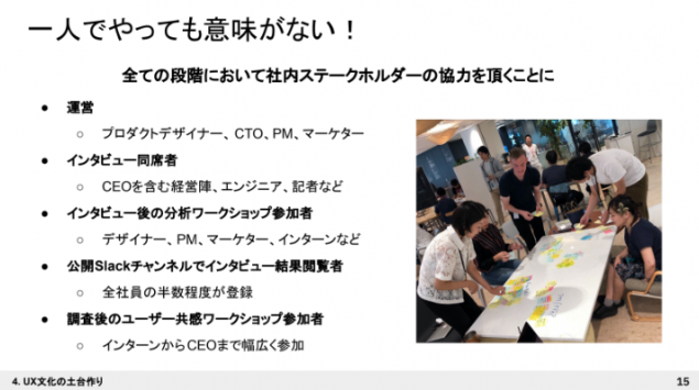 驚きなのは、以下の4段階で実施した調査の全段階で、CEOをはじめ、デザイナー、マーケター、エンジニア、そしてインターンにいたるまであらゆる社内ステークホルダーの協力をあおいだ、というマックスウェルさんの「巻き込み力」です。