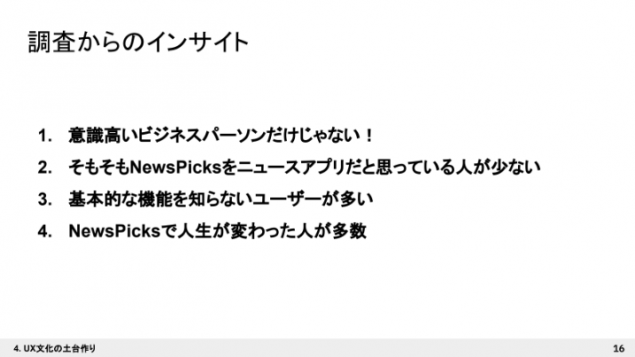 この調査から得られたインサイトは、「ユーザーは意識高いビジネスパーソンだけではない」「NewsPicksを単なるニュースアプリではなく、人生の参考になるメディア、世の中の流れを知るためのメディアであると思っているユーザーが多い」など、当初の仮説には無いものでした。