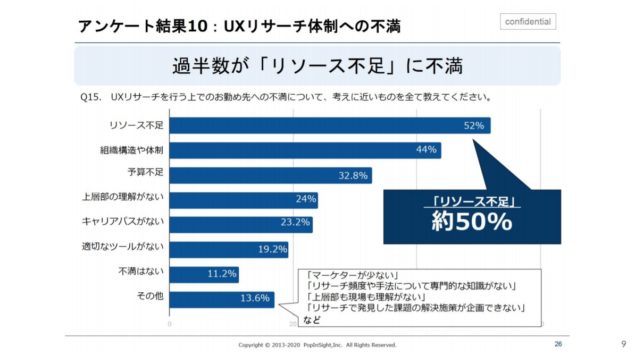 こちらはポップインサイトさんが国内のリサーチをしている企業115社にアンケート調査を行った「UXリサーチ実態調査2020レポート」の中のアンケート、「UXリサーチ体制への不満」の結果です。