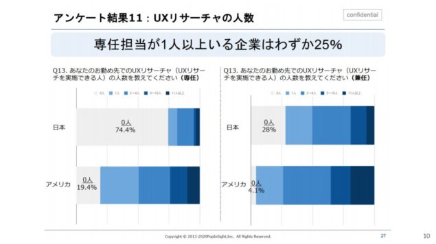 続いて「UXリサーチャーの人数」に関しては、「専任担当が1人以上いる企業はわずか25%」という結果が出ています。どうしたらもっとリサーチをやれる環境にできるのかが課題となっています。
