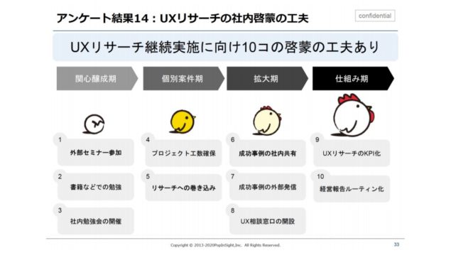 先ほどお伝えしたように兼任の方がビジネス効果は大きいので、現在はリサーチャーを増やすのではなく、プロダクトマネージャーやデザイナーがより積極的かつ合理的にリサーチできるよう取り組んでいます。