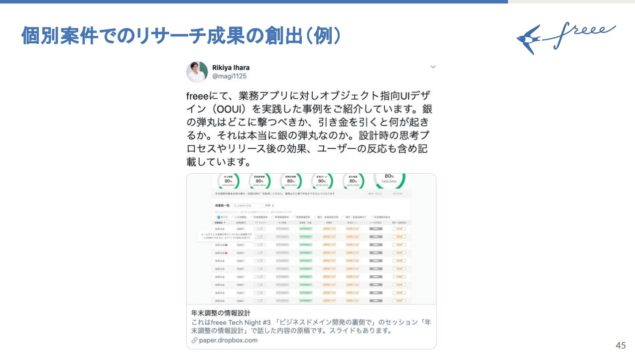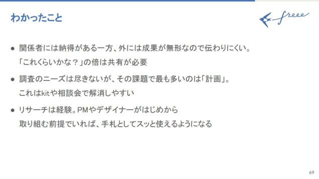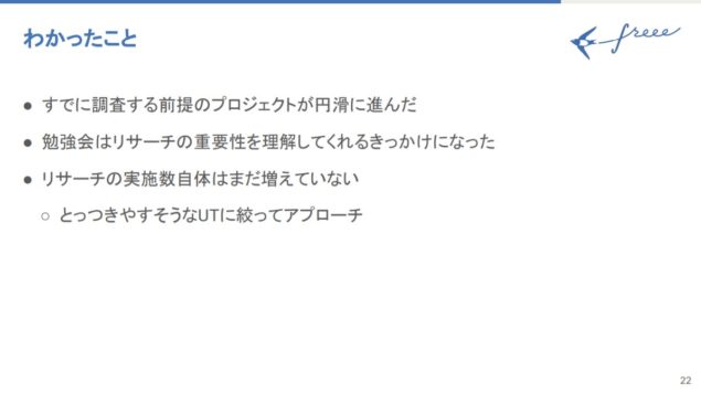もちろん専任リサーチャーがかかりきりにならないと分からないリサーチもありますが、兼任で他のプロダクトマネジメントやデザインと組み合わせてリサーチを行う方がリサーチによるビジネス効果が大きくなるということは納得です。