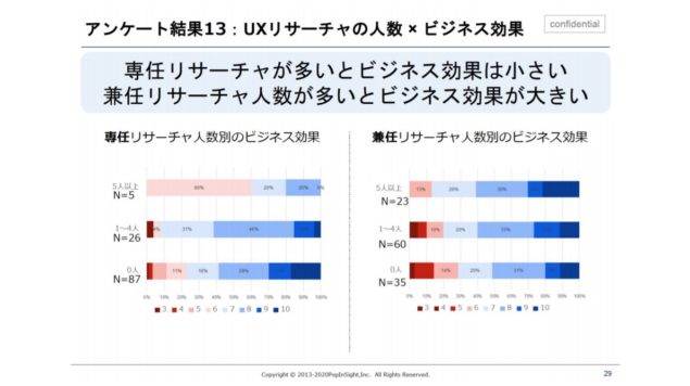先ほどのポップインサイトさんの「UXリサーチ実態調査2020レポート」に、「UXリサーチャーの人数 × ビジネス効果」というものがあります。専任リサーチャーが多いと「ビジネス効果が小さい」と回答し、兼任リサーチャーが多いと「ビジネス効果が大きい」と回答する相関がありました。