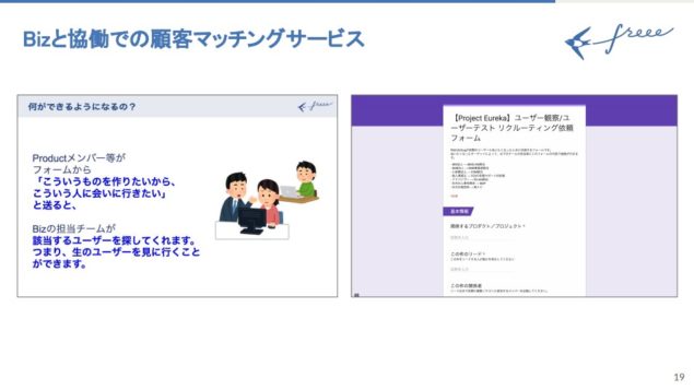 企画や開発のメンバーに「こういうものを作りたいから~な人に会いたい」とGoogleフォームに書いてもらい、それを見た私とビジネス職の人が相談して、要件に当てはまる人とのインタビューをセッティングする、というものです。
