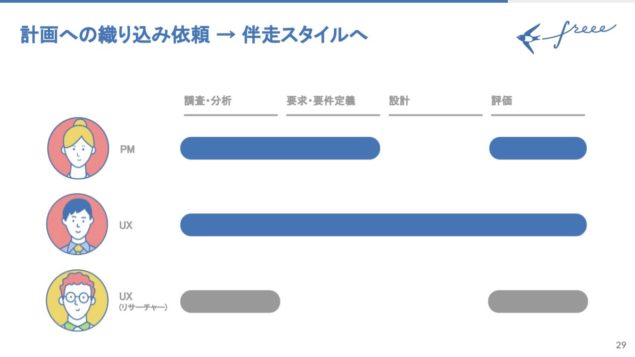 そして、リサーチャーではなく各プロジェクトの担当者がメインでユーザビリティテストを実施する、伴走スタイルに移行していきました。これによりリサーチャーのキャッチアップコストを削減できました。
