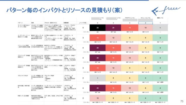 社内で行ってきたリサーチのパターンが下のスライドの左側に書かれています。そのパターンに対しての抽象度に数字をつけ、さらにプロダクト・モジュール・機能などの影響範囲を数値化しています。それを掛け算したものがそのリサーチで得られる効果で、それに対して必要なリソースがどれぐらいなのかをマッピングしています。