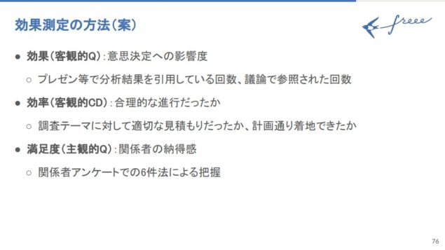 そして効果測定を行います。こちらは次の「効果」「効率」「満足度」によって定量化できるのではないかと考えています。