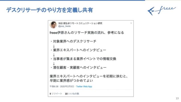 また、リサーチをする前に社内で有識者の意見を聞いたり、資料を集めて推定したりしないでユーザーリサーチをすると、机上で調べればわかったことをリサーチしかねません。今使える手札である程度まで推論する「デスクリサーチ」のやり方を共有しました。