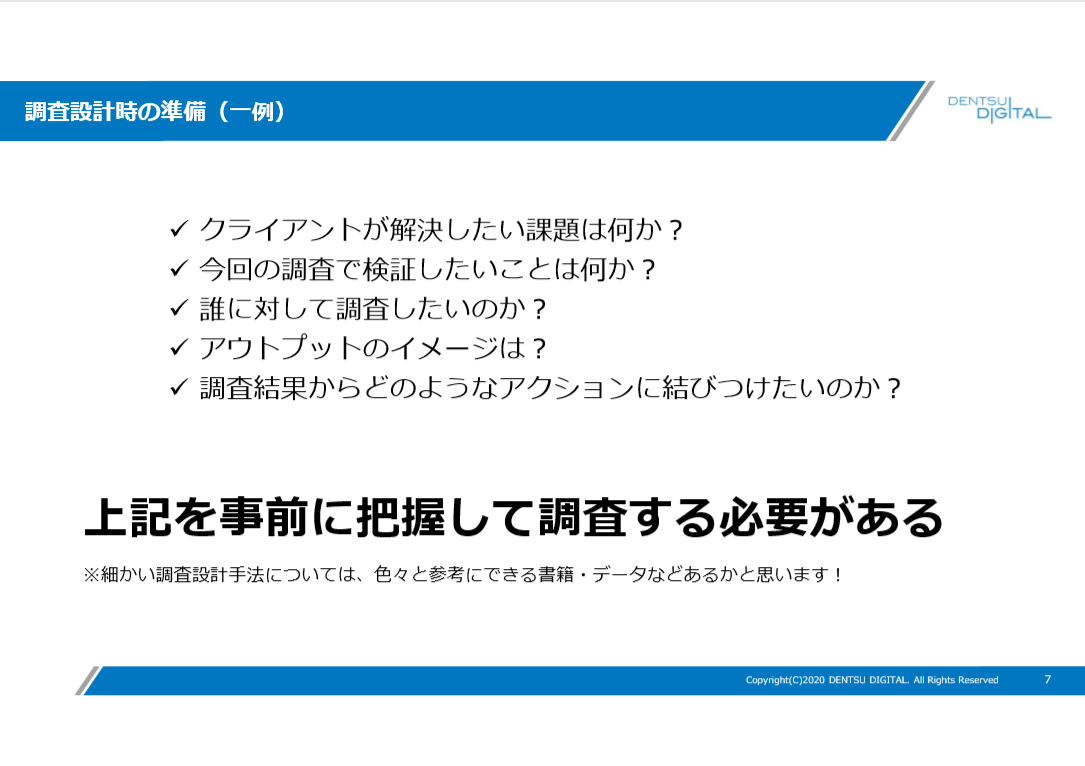 調査設計の準備で川野さんが意識しているのは、「線」での設計です。アクションにつながるリサーチを設計するには、「クライアントのビジネス課題は何か」「リサーチで何を明らかにしたいのか」「リサーチ結果が出た後どんなアクションをとるか」「そのアクションの効果測定は何を指標とするか」といった一連を「線」として紐づけることが大事です。