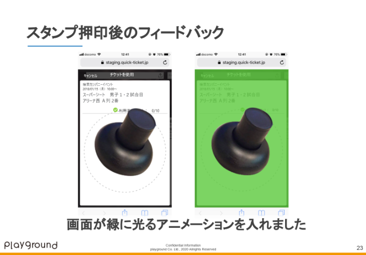 例えば、もぎりスタッフによるスタンプ連打が多発した事例。押せたかどうか不安で、スタッフがスタンプを何度も押す、という事態を開発チームは想定していませんでした。現場のフィードバックを受け、スタンプを押すと端末の画面が緑に光るアニメーションを入れたところ、もぎりから入場までのスピードが大幅アップしました。
