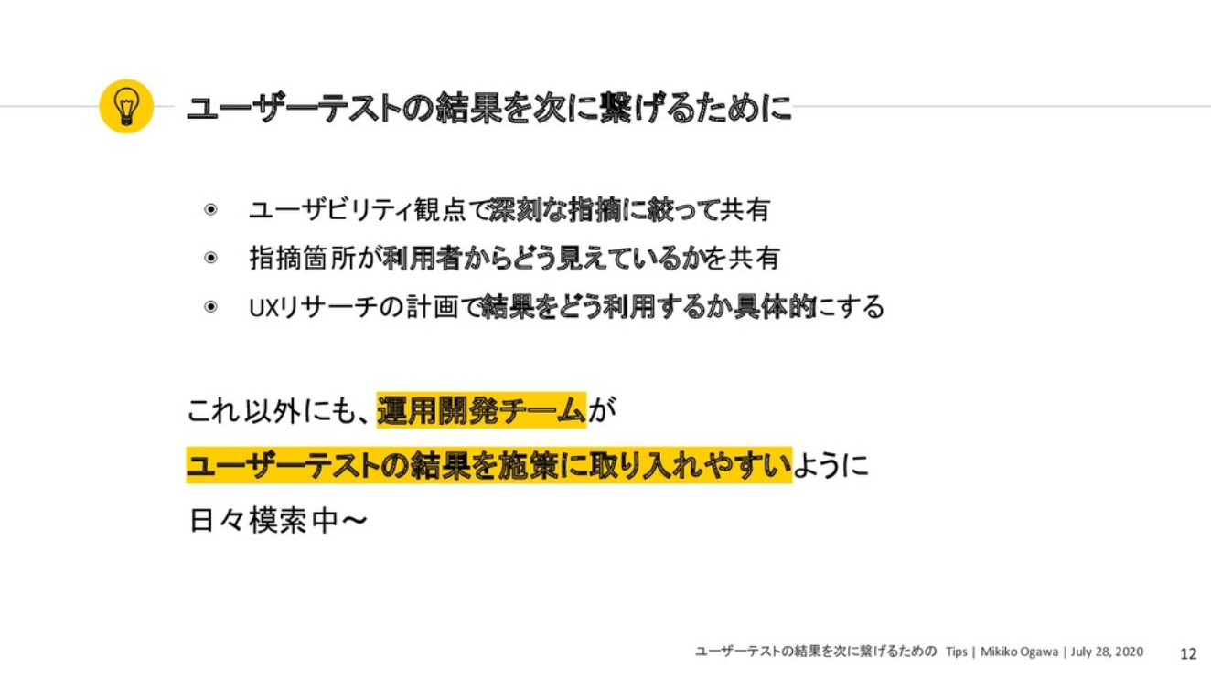 小川さんには、社内のさまざまな部署からさまざまな文脈で「ユーザーテストしたいです」と相談を受ける立場での「しくじり」体験とその改善方法をお話しいただきました。
