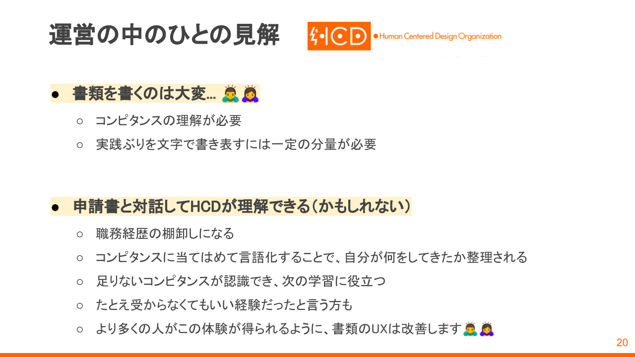 審査書類を書くのは大変です。「週末を2回使ったくらいでは終わらないので、計画的に進めてください」ということは説明会でも強調しています(笑)。審査書類と対話した結果、HCDの理解を深めるひとが増えて欲しいと思っており、書類のUXは改善していきたいと思います。