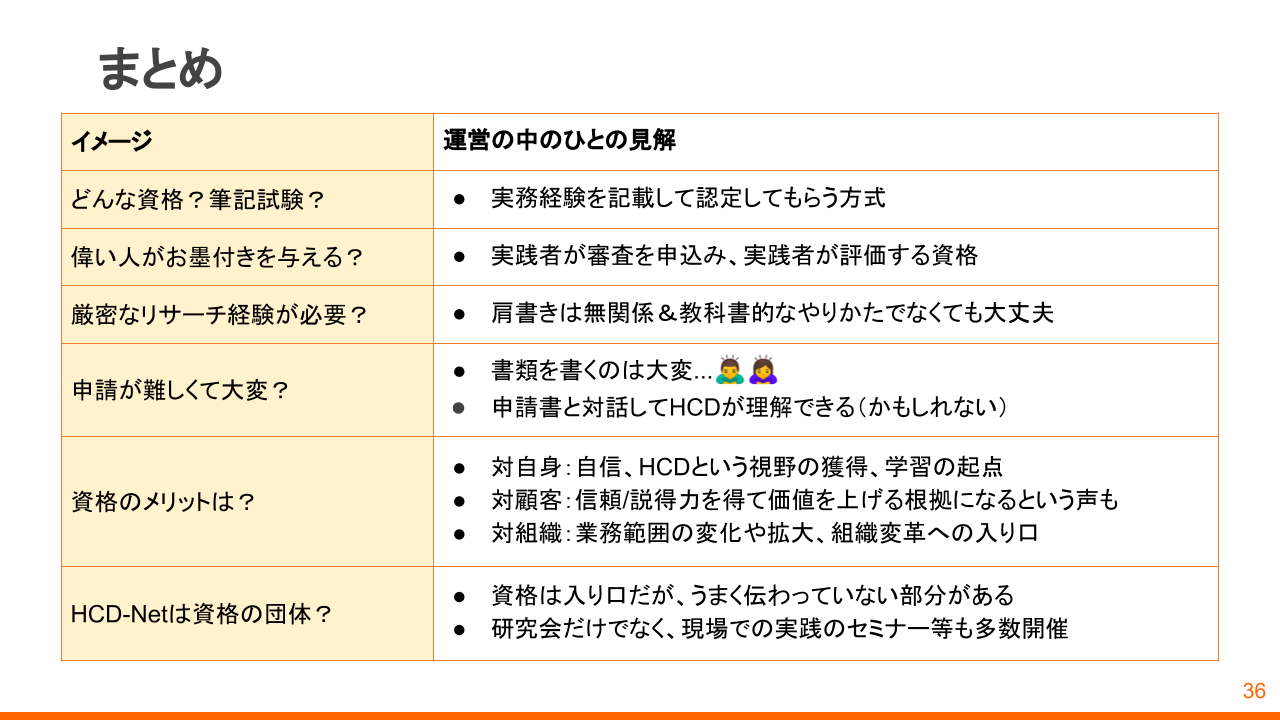 HCDプロセスと資格要件を確認した後は、「ぶっちゃけトーク会」本編です。