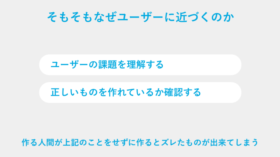 セミナー冒頭で城さんが触れたのは、「ユーザーに近づく」べき2つの理由。デザイナーやエンジニアが上記2つのことを気にせずにものを作ってしまうと、「ニーズとズレたものができ上がってしまう」と話します。