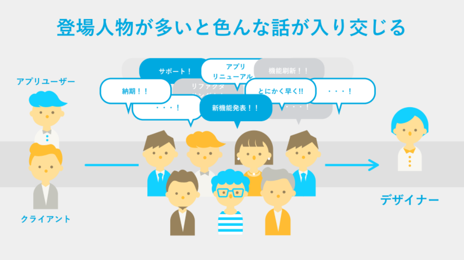 「登場人物」とはつまり、社内ステークホルダーやクライアントなど、サービス改善に取り組むすべての関係者のこと。例えば、関係者の一人が「この機能をそろそろ刷新したい」と言ったとします。それを受けてデザイナーは、「刷新するための課題はなんだろう?」と情報を探します。しかし、登場人物が多いと、営業やエンジニアなど様々な部署・立場の人が多様な課題を挙げ、話が入り交じります。