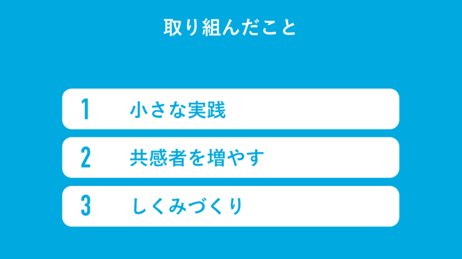 そして重要なのは、小さな取り組みの中で出てくる成果を、関係者に共有すること。「なぜ、この調査をしたのか」という取り組みの意義を示した上で結果を報告し、改善案も具体的に示すと納得感を得てもらいやすく、議論が活発になります。