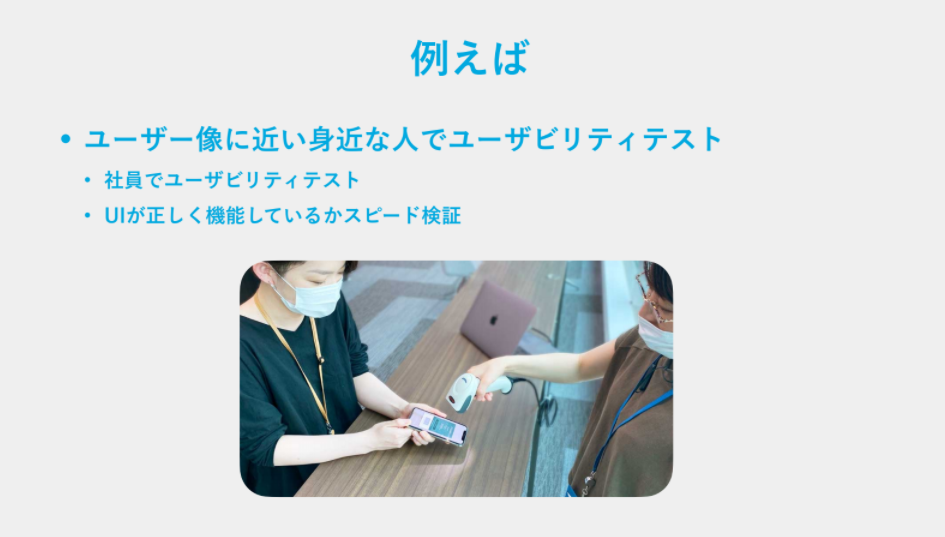 例えば、UIが正しく機能しているかをスピード検証できる方法として、社員でユーザビリティテストをすることが挙げられます。実際にヤプリでは、バックオフィスや本部の人などに協力してもらっているそうです。