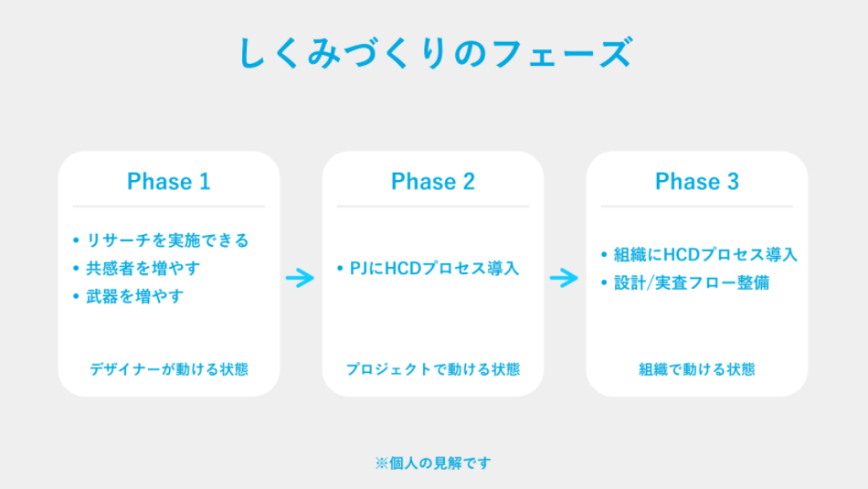 上記のような取り組みには、多くのエネルギーが必要です。デザイナーが動ける状態から、プロジェクトとして動ける状態を経て、組織で動ける状態へと段階的に移行するしくみづくりができれば、と城さんは提案されました。