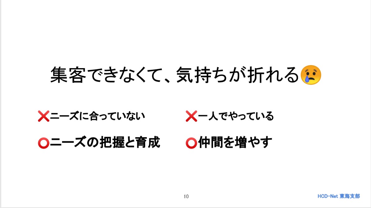しかしながら、「続けること」は簡単なようで難しいことです。加藤さんご自身も経験した「集客できなくて、気持ちが折れる」という状況を乗り越えるポイントについて「集客できない」「気持ちが折れる」の2つに分けて振り返りながら解説していただきました。