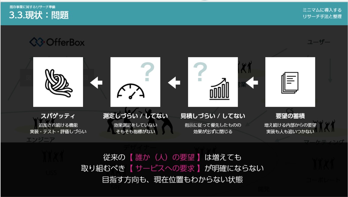 リソースが十分でないなか、「要望」をとにかくこなすことに精一杯。効果を狙って動くことも、効果測定もしづらくなった結果、機能拡充したサービスが複雑になって、後で実装・テスト・評価しづらくなる、いわゆる「スパゲッティ」と呼ばれる状態になったそう。