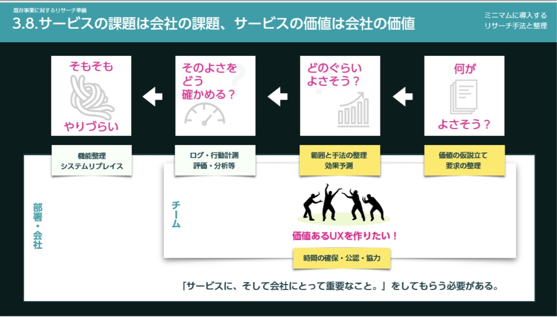 村治さんたちが重視したのは、「サービスの課題は会社の課題、サービスの価値は会社の価値」という前提に立ちもどることでした。従来どおりエンドユーザーや社内からの要望をそのまま適用するのではなく、「その価値を具体的に確かめていく」というリサーチのプロセスが重要です。