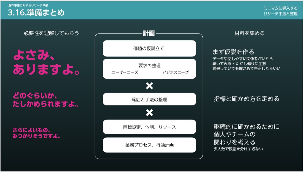 リサーチ計画をしっかりと立てて、「よさみ」(=リサーチの価値や必要性)を会社に理解してもらえば、あとは実施するのみ。「理想は大きく、導入はミニマムに」、サービスの価値を見つけて高めていけたらいいですね、と村治さんはトークを締めくくりました。