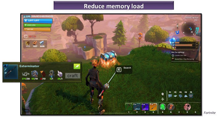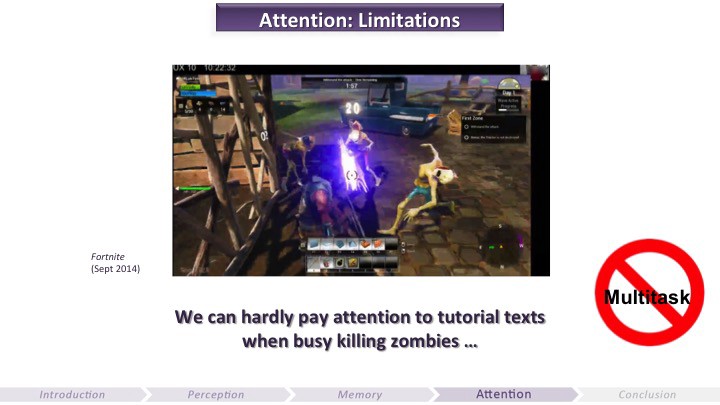 では次に、人間の心理的なプロセス(知覚、注意、記憶)の限界と、フォートナイトの開発でその限界をどう取りあつかったかをご紹介します。