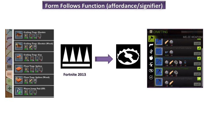 UXテストの結果、トラップのアイコンをトラバサミ(ばね仕掛けで獲物の足を挟む装置)のような見た目に変更することにしました。フォートナイトでは、トラップで動物を捕まえることはないのですが、テストではプレイヤー全員がこの新しいシンボルがトラップであると理解しました。