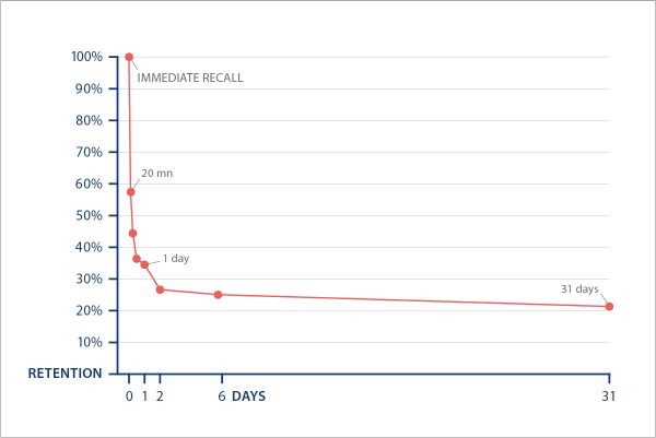 しかし、一方で、人は多くのことを忘れます。18世紀後半、ドイツの心理学者ヘルマン・エビングハウスは、忘却には指数関数的な性質があることを発見し、有名な「忘却曲線」を確立しました。