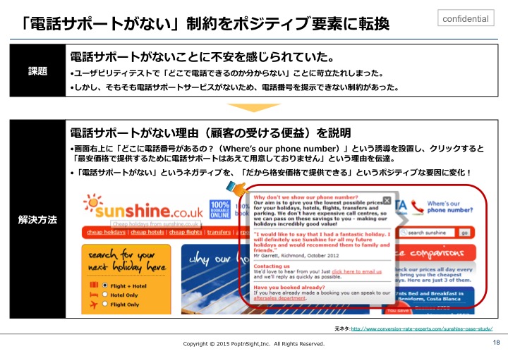 まさにWebサイトの話というよりはビジネスモデルの話で、電話を置かないことで間接コストを下げるという話なんです。それを、上手い言い方、出し方でメリットに変換するということで印象が上がることもあります。