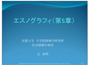 さらに専門性の高い内容について学びを深めたい方には、京都大学フィールド情報学のサイトがおすすめです。なかでも、「エスノグラフィ」と題されたスライド資料は、二つの具体事例の詳細が解説されており、実際の手法を学びたい方にとって大いに参考になる内容です。