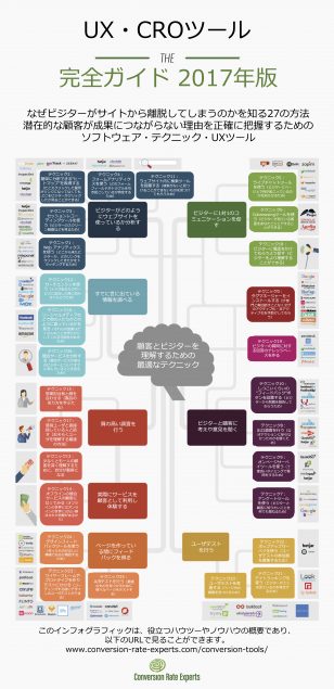 ニューヨークやロンドンに展開するコンサルティング会社、Conversion Rate Experts社が、UX(ユーザーエクスペリエンス)とCRO(Conversion rate optimization コンバージョン率最適化)のためのツールと27つのグロースハックテクニックをまとめたインフォグラフィックを発表いたしました。