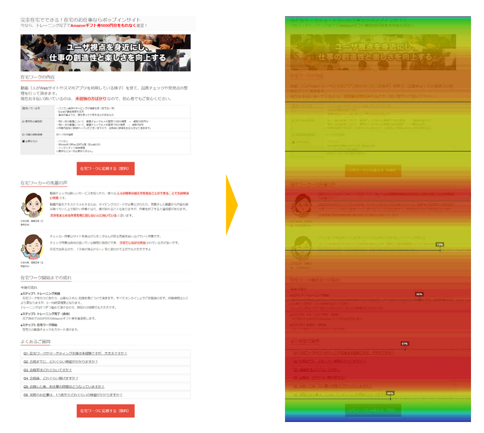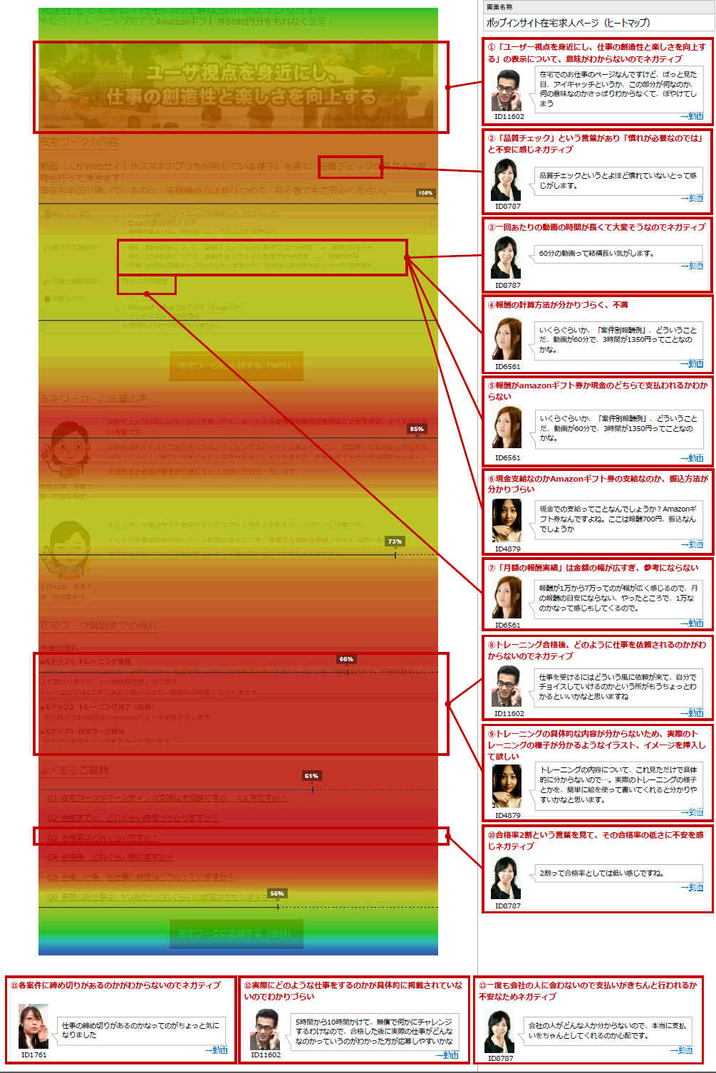 下の図は、弊社のサイトの在宅ワークに関するページをヒートマップツールで解析した結果(左)と、ユーザテストで得られたユーザの意見(右)とを比較したものです。