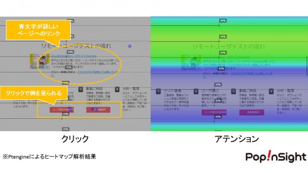 右側のアテンション(熟読箇所)では「リモートユーザテストの流れ」自体に注目されていることはわかりますが、左側のクリックの解析画像を見ると、ユーザテストの流れの詳しい説明よりも操作画面や動画の例が気になってクリックしていることがわかります。