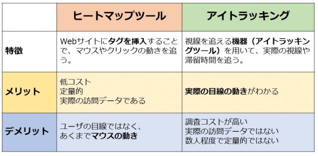 その説明の前に、ヒートマップで得られる結果とユーザテストで得られる結果にはどのような違いがあるのかを整理してみましょう。
