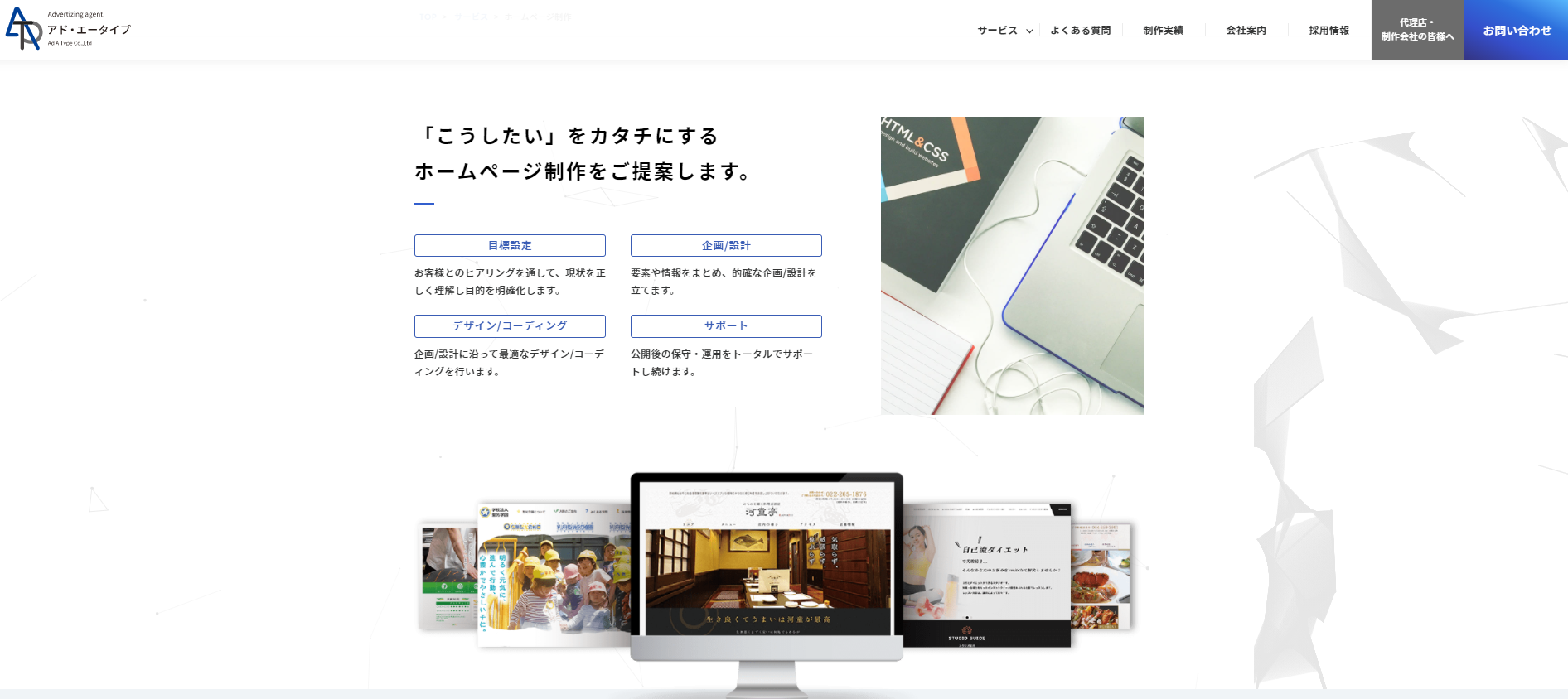 Webページを「営業ツール」と考え、効果的な広告と集客はもちろん、費用対効果ということも検討し、Webコンサルティングの視点からサービス提供するWeb制作会社です。そのため、DTP制作、SEOサービス、CMS導入など、多くのサービスを提供しています。制作実績は、実に多様な業種にわたっており、サービス内容の豊富さや質の高さがうかがえます。