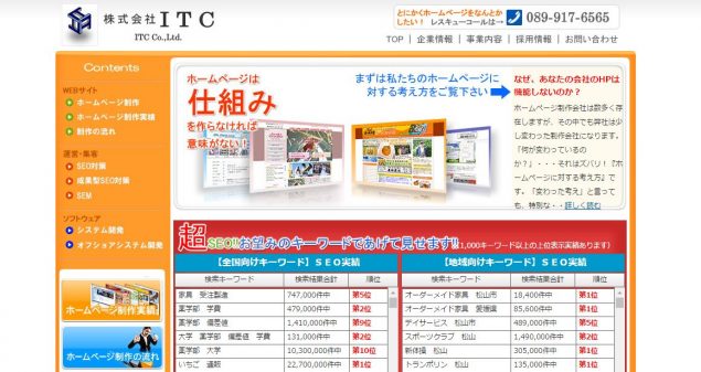 「ホームページ制作の要点はデザインでも技術でもない。いかに訪問者にお問合せや購買などの意思決定をしてもらう仕組みを作るかに尽きる」と断言するWeb制作会社です。作る、運営する、という請け負いよりも、顧客の商売を手伝う姿勢を貫きます。ヒアリングを重視し、目的を明確化してから、ゴールを顧客と共有しつつ活きるサイトづくりの実現を目指します。検索連動など広告を扱っています。顧客は愛媛県内を中心に不動産・探偵事務所・トリマースクールから松山大学まで、多岐に渡ります。